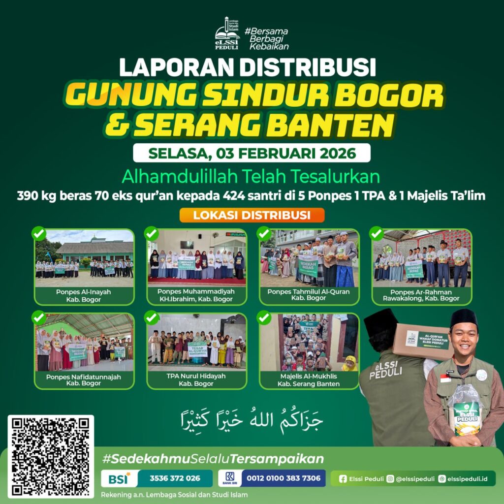 Alhamdulillah di awal bulan Febuari, telah terdistribusi pake Beras dan Mushaf Al-Qur’an ke 7 Pondok pesantren yang ada di Gunung Sidur Bogor serta Serang Banten. distribusi kali ini sebanyak 390Kg beras, 70eks Qur’an dengan total penerima manfaat 424 santri yang ada di 5 Pondok pesantren, 1 tAP dan 1 Majelis Ta’lim.