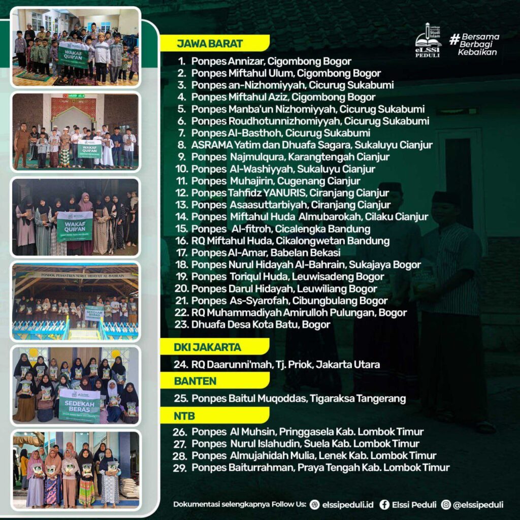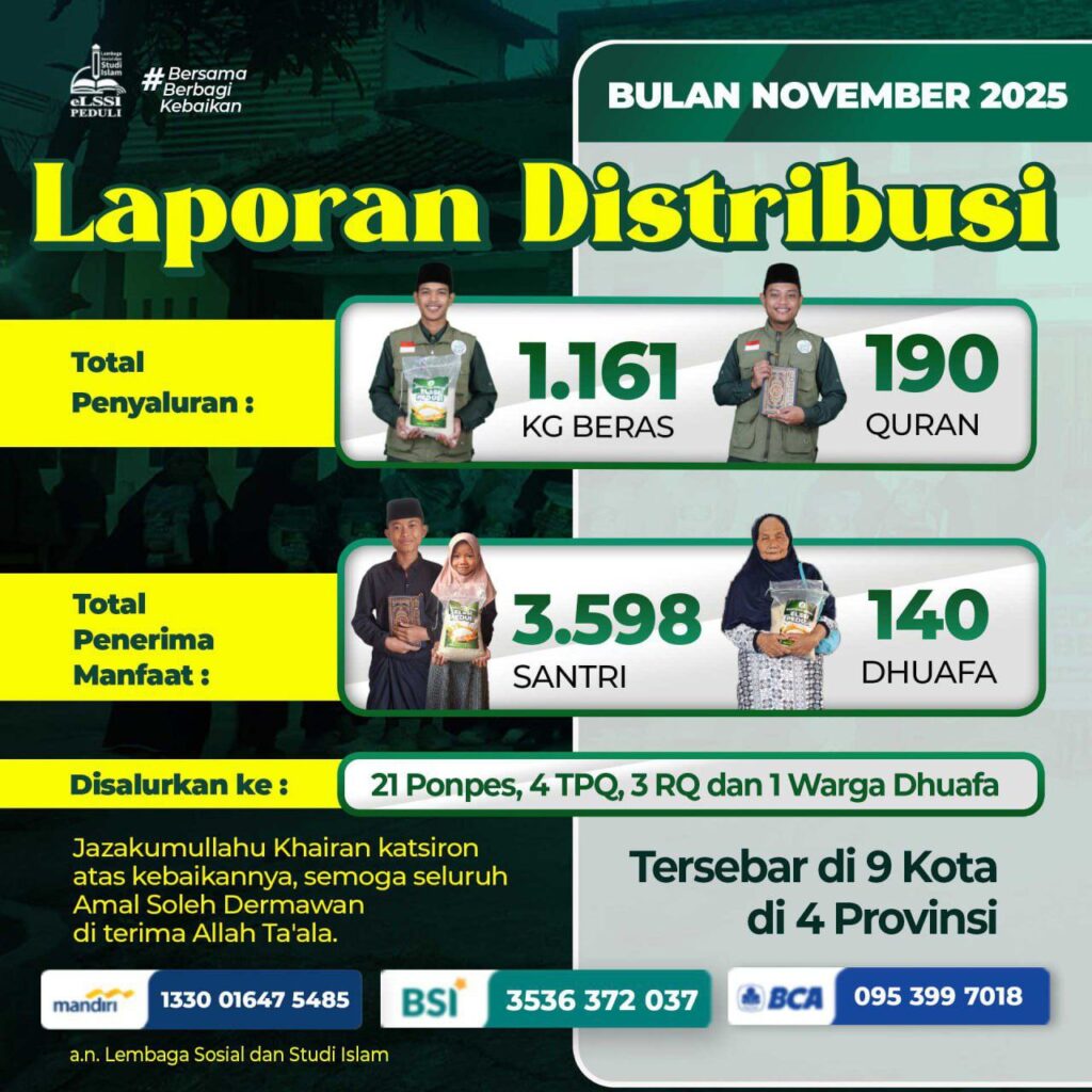 Sepanjang bulan November 2025, tersalurkan 1.161 kg beras dan 190 mushaf Al-Qur’an. Amanah ini menghadirkan manfaat bagi 3.598 santri dan 140 dhuafa, yang tersebar di 21 pondok pesantren, 4 TPQ, 1 wilayah warga dhuafa, dan 3 Rumah Qur’an di 9 kota dan 4 provinsi.